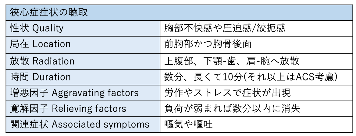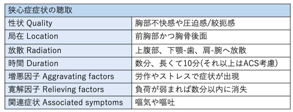 Quality、Location、Radiation、Duration、Aggravating factors、Relieving factors、Associated symptomsを中心に病歴聴取を行います。