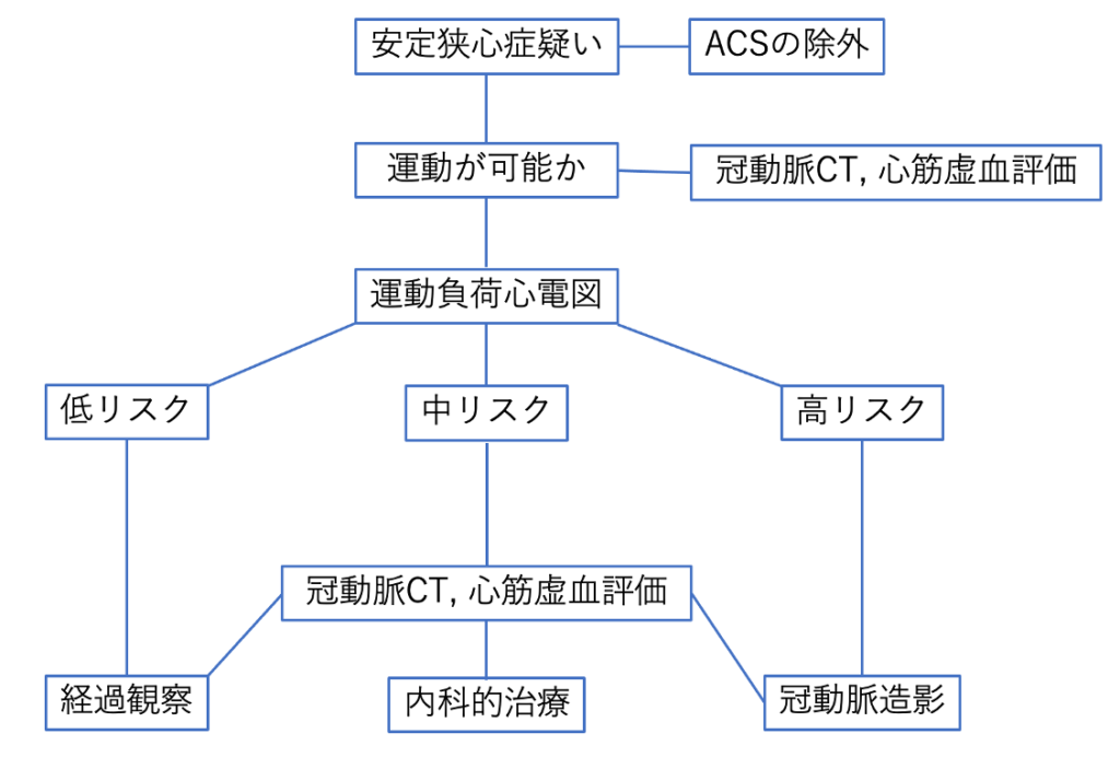 安定性狭心症が示唆される場合には、まず運動負荷心電図を行うことを考慮します。この時ベースの心電図がすでにST変化などある場合には、冠動脈CTやその他のストレステスト(運動負荷エコー、シンチなど)を考慮します。最終的にはCAGで診断します。