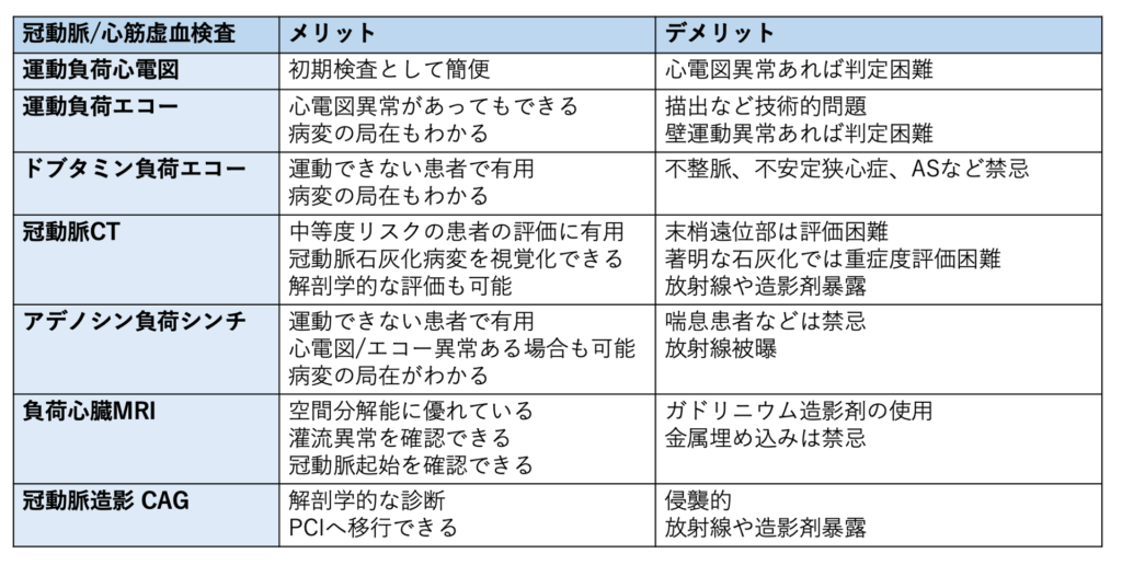 運動負荷心電図、冠動脈CT、SPECT、冠動脈造影CAGなどを検査前確率や併存症などを考慮し検査を選択します。