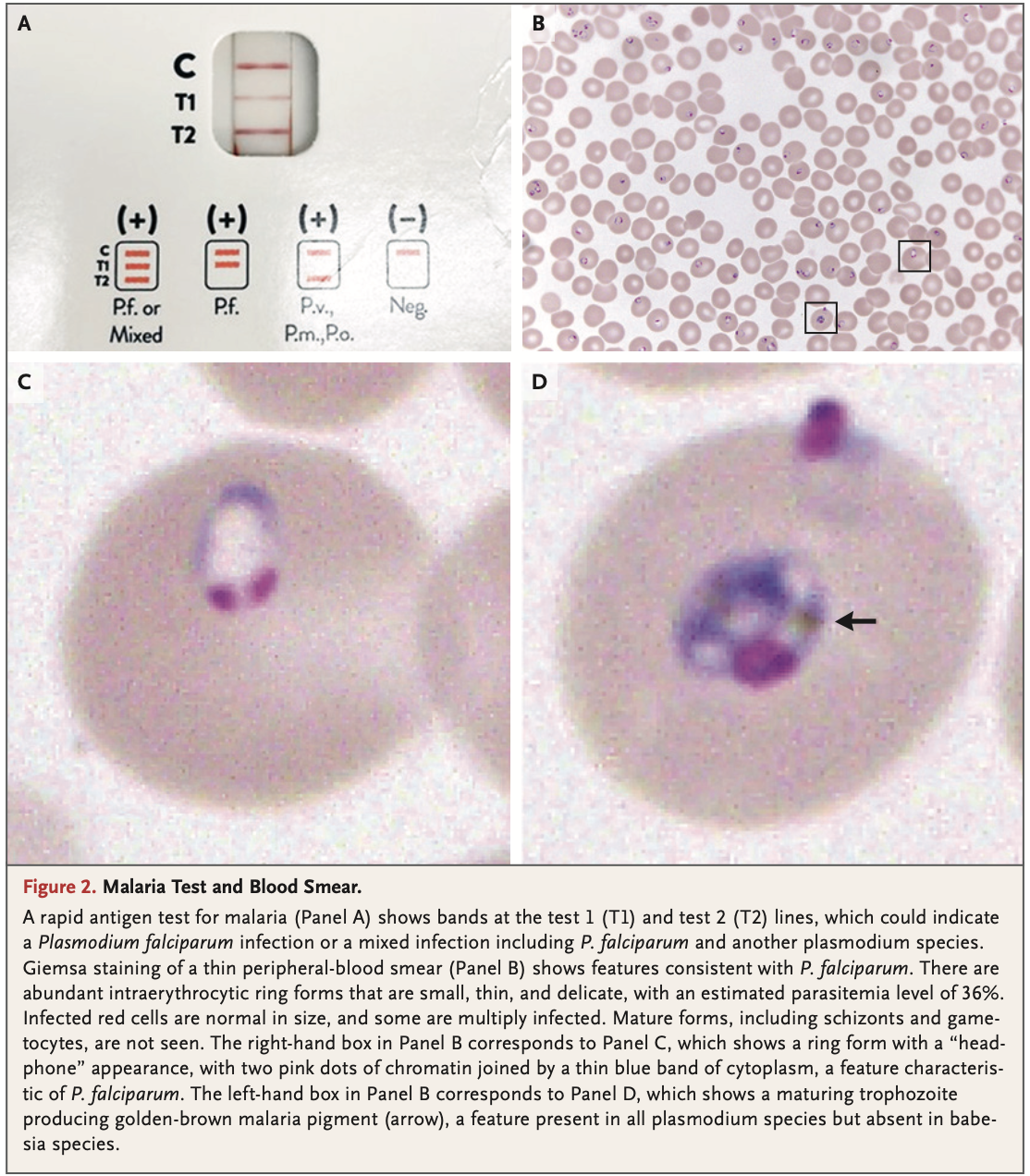 マラリア検査としてRapid antigen test(迅速抗原検査)が通常行われる。陽性となれば塗沫検査にて感染の有無、寄生虫血症(Parasitemia)の程度を確認する