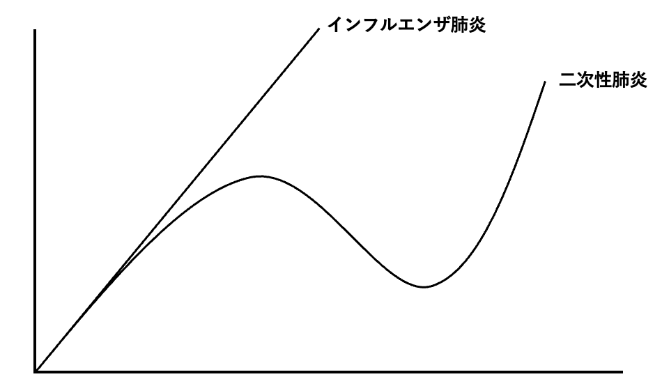 それぞれの病歴の特徴は、二次性肺炎はインフルエンザとしての症状は落ち着いてきた後に再度肺炎症状が出現するという病歴であり、インフルエンザ肺炎はインフルエンザの発症からそのまま肺炎になるというイメージです。