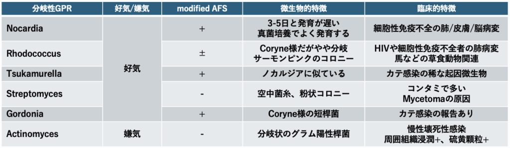 臨床的に頻度が高いのはNocardiaとActinomycesであり、両者はmodified acid fast stainで染まるか染まらないかという点で異なり、培養が生えるまでの区別に重要とされていますが、私が所属している施設の微生物検査室では行なっていません(他施設ではどうなのかは気になっています)。