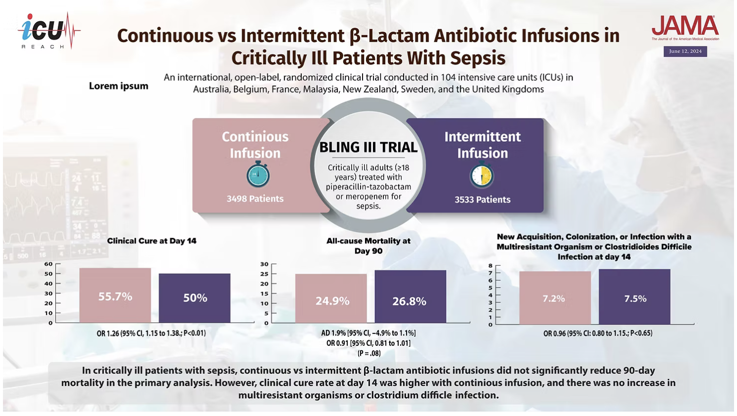 敗血症/敗血症性ショックを対象としたランダム化試験で、ピペラシリン・タゾバクタム or メロペネムの持続投与を間欠投与を比較し、90日死亡率は差はなかったが(24.9% vs 26.8%)、臨床的治癒率が持続投与群で改善した(55.7% vs 50.0%)と報告されています。その後、この試験を含めたメタアナリシス(JAMA 2024)では敗血症/敗血症性ショック患者における全死亡(90日)および臨床的治癒率が改善することが示唆された。