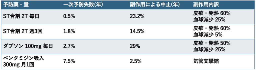 しっかり予防効果を出したいならST合剤 2T毎日が最も有用ですが、副作用中止率は23.2%と高く、ST合剤 2T 週3回にすると副作用中止率は14.5%と減少するが、予防失敗率も1.8%と上昇してしまうというジレンマが認められます。